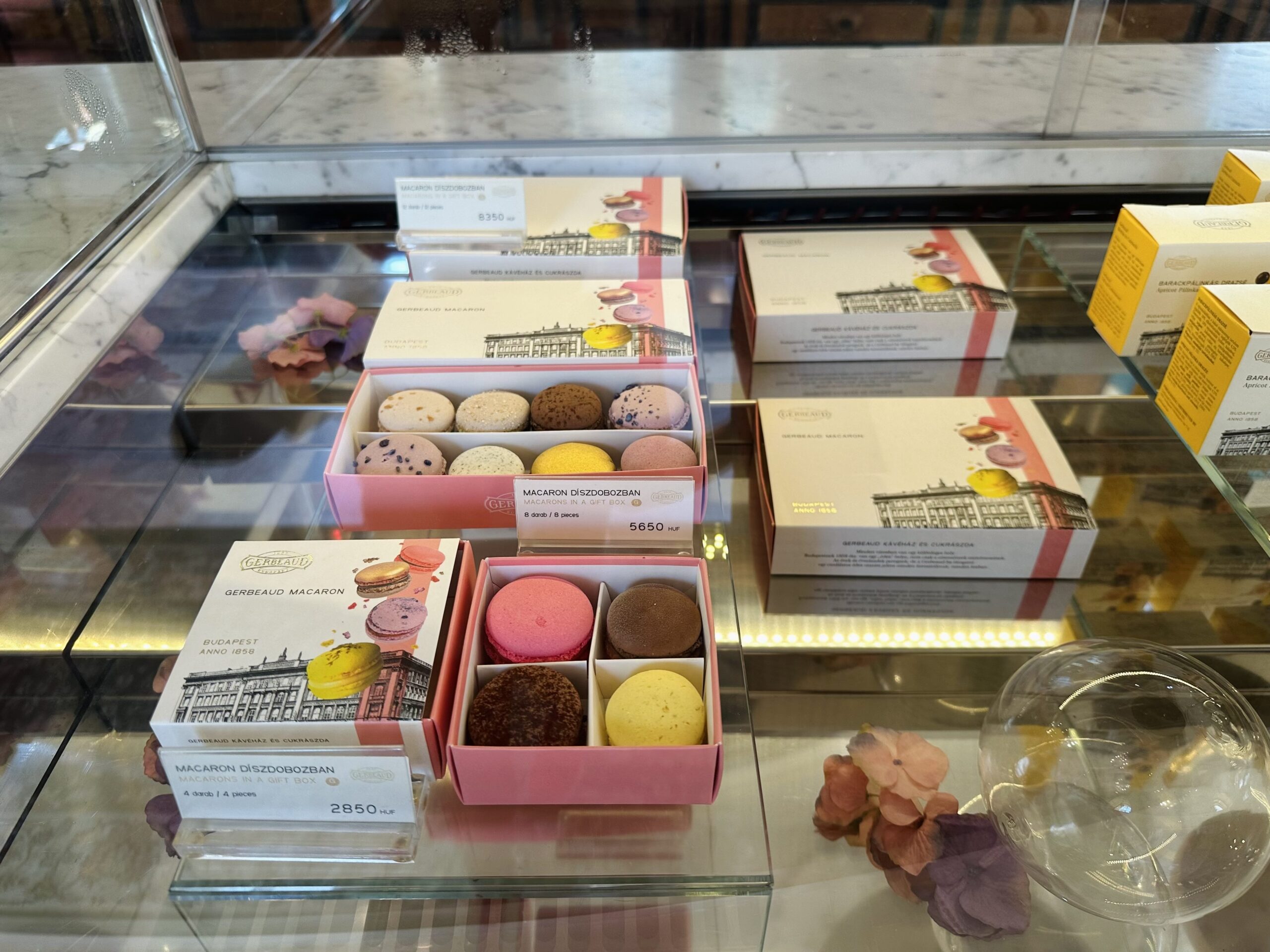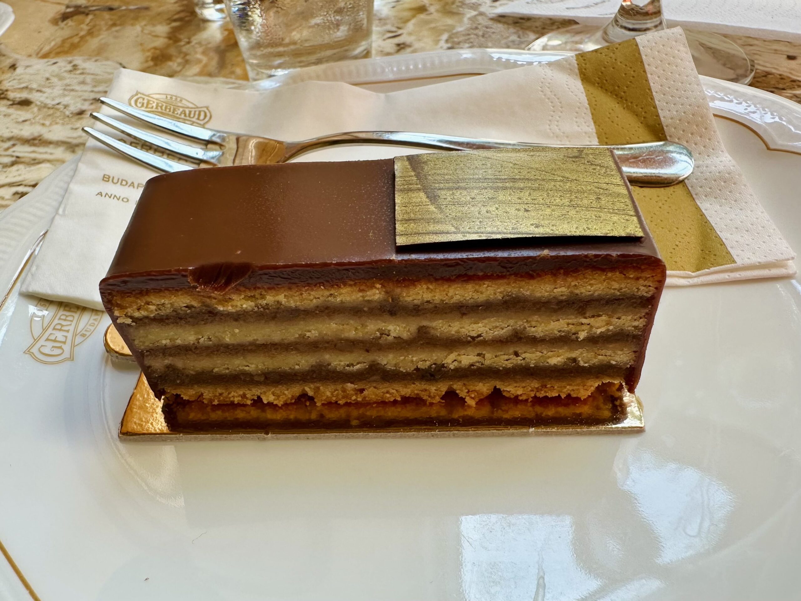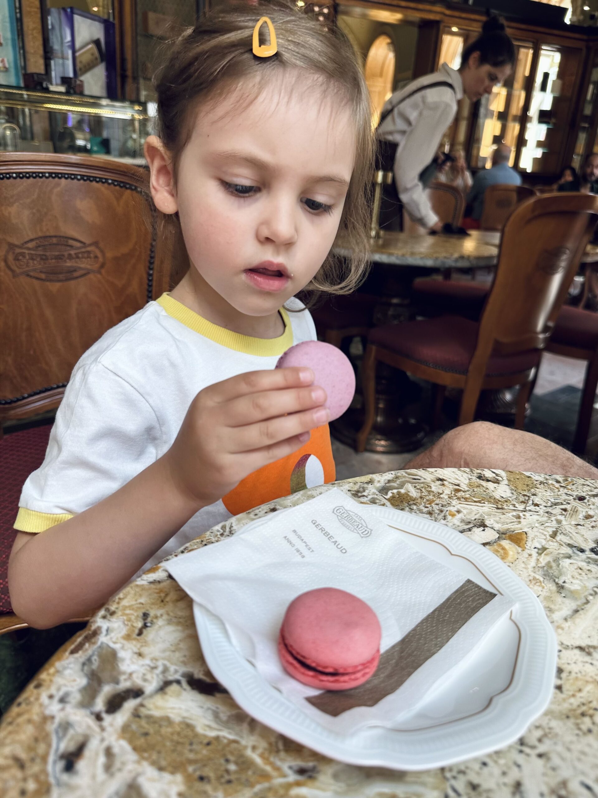 Am optat pentru prăjitura care poartă numele localului și a maestrului patiser care l-a făcut celebru, Émile Gerbeaud – straturi cu gem de caise, nucă și glazură de ciocolată, preparată în continuare după rețeta originală, plus câteva macarons pentru cea mică. Toate au fost foarte bune, la fel și ouăle cu șuncă pe care le-am mâncat la micul dejun și cafeaua.