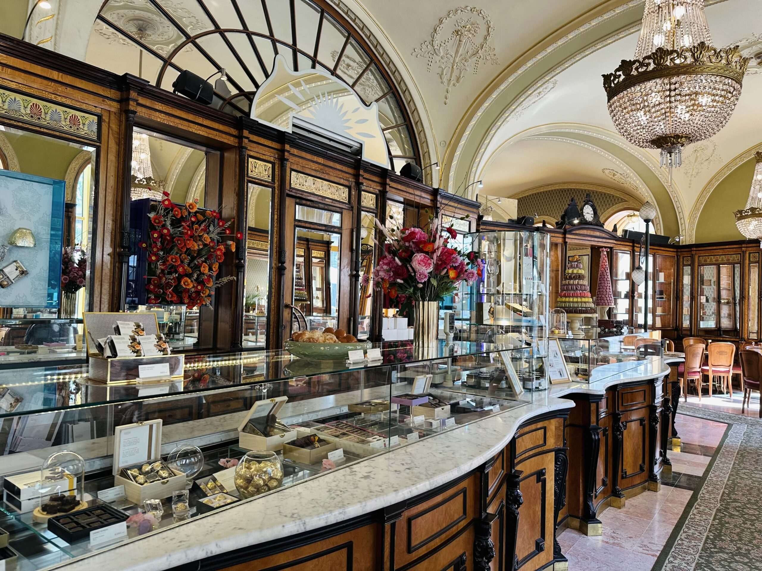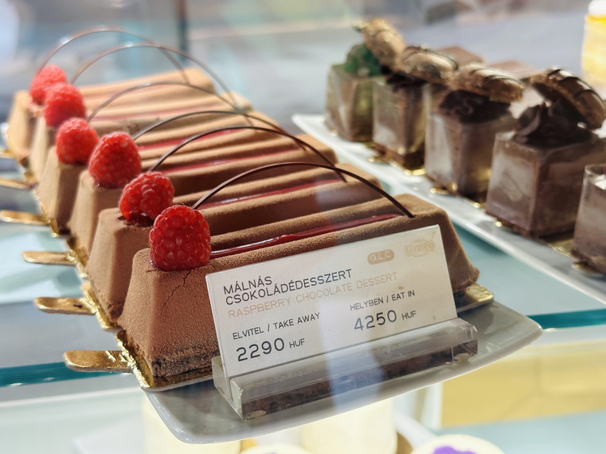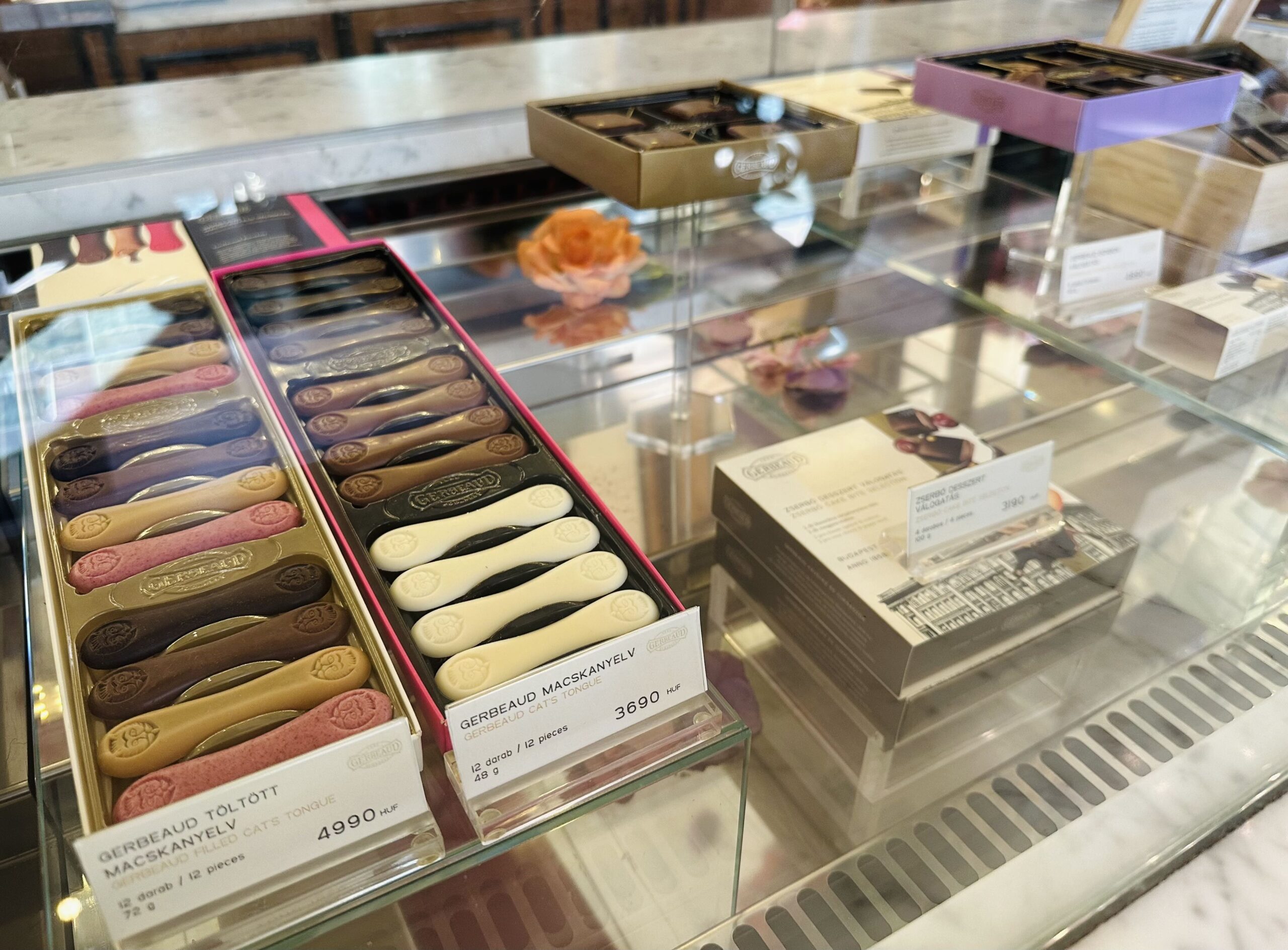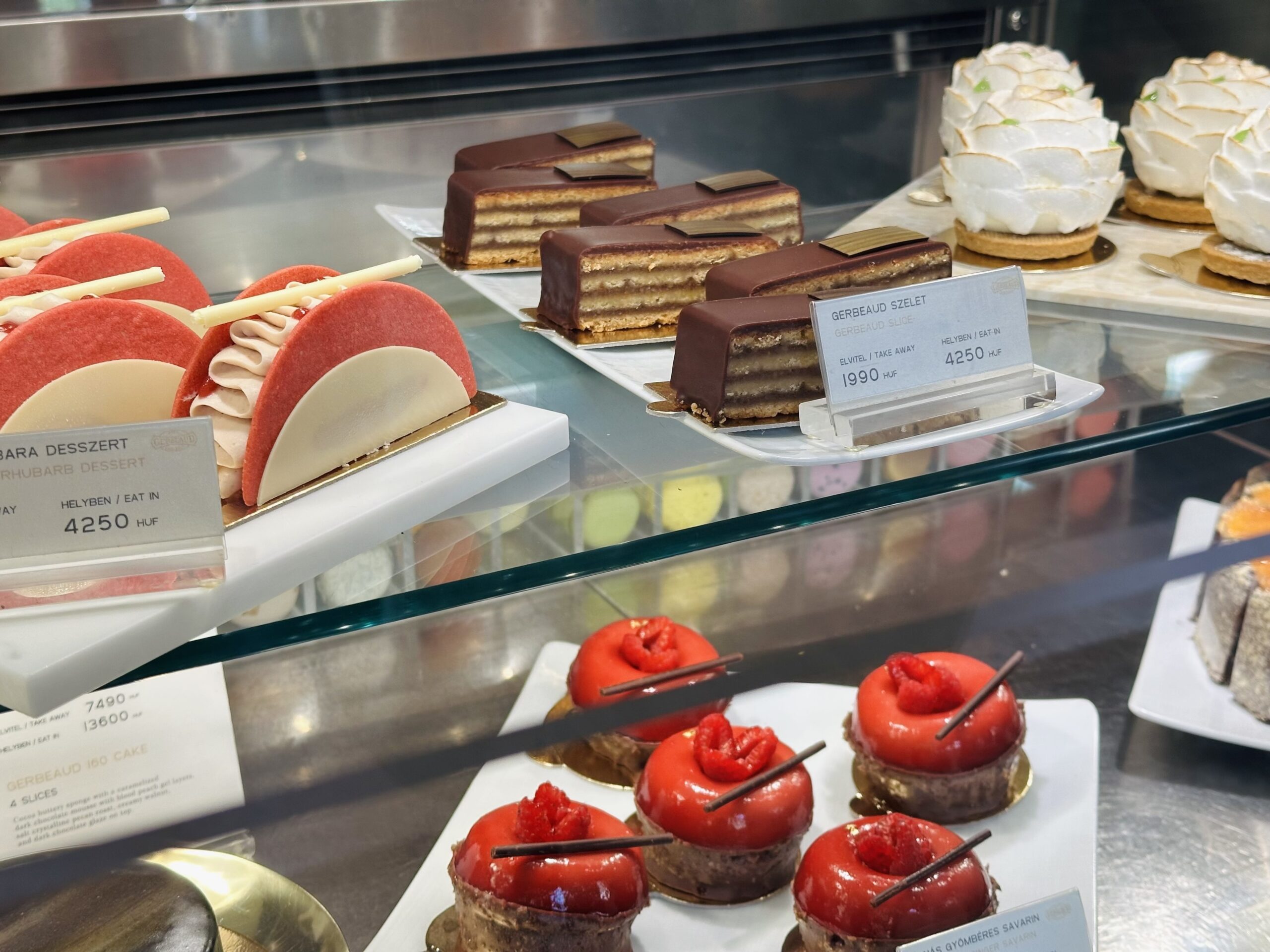 În fața vitrinei e greu de ales – Doboș, Esterházy, Sacher, Somlói, prăjituri cu ingrediente de calitate, ornate și tăiate perfect, cu ciocolată, cu zmeură, fistic sau rubarbă, macarons, baigli cu mac sau nucă, limbi de pisică multicolore, bomboane de ciocolată neagră cu vișine și coniac, drajeuri cu pălincă de caise, înghețată artizanală… Lista tentațiilor este lungă.