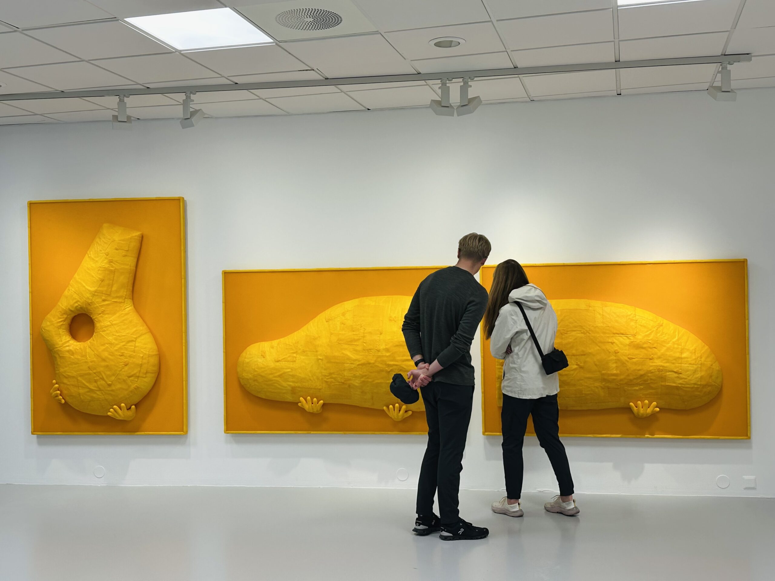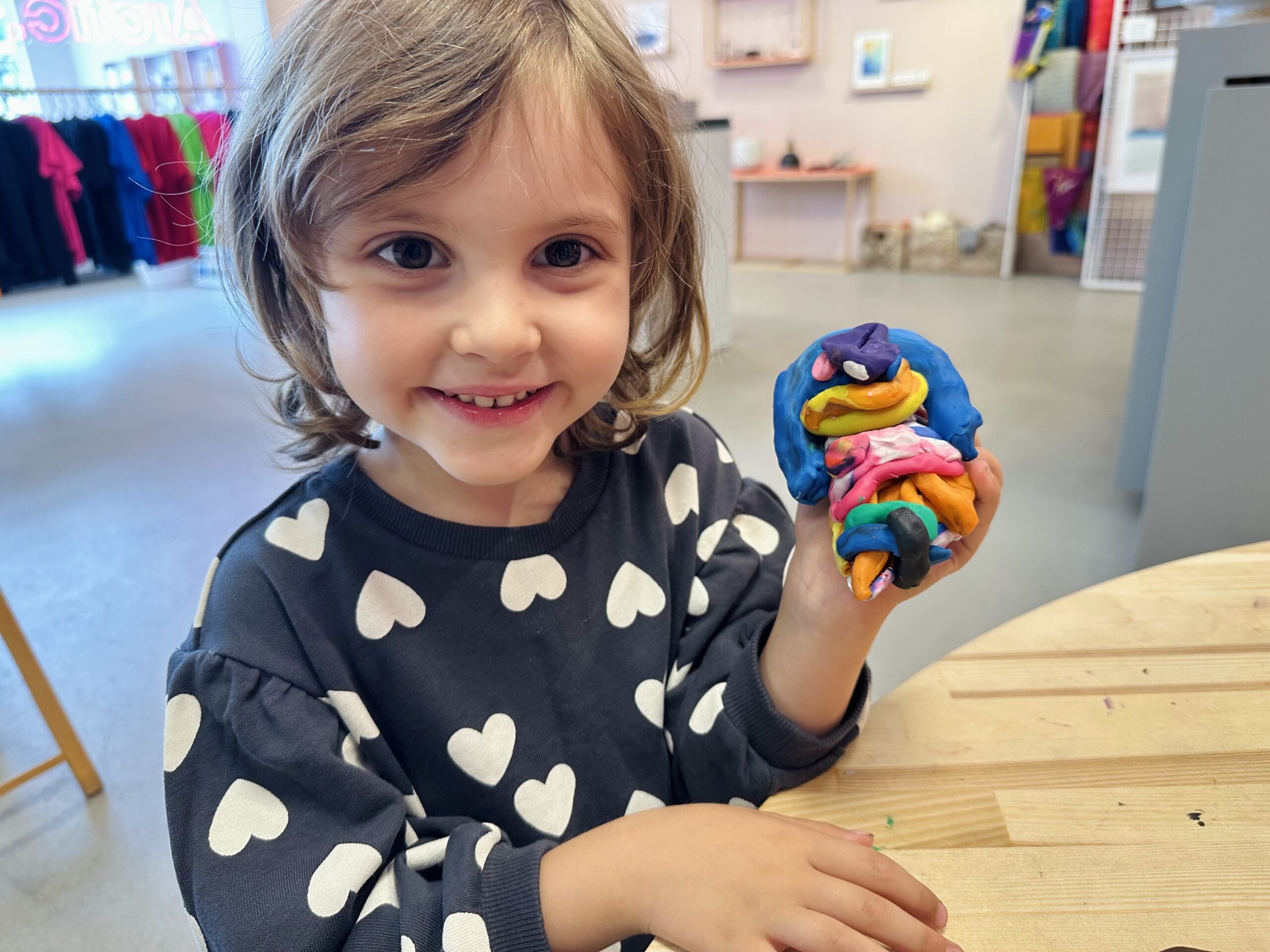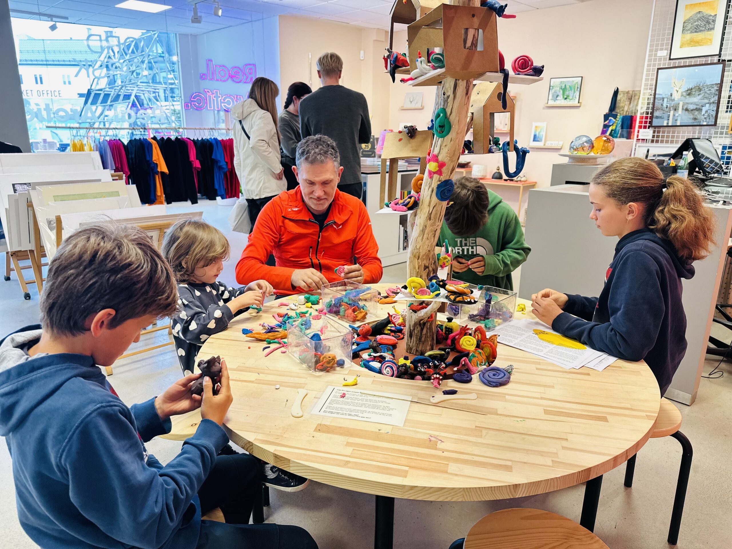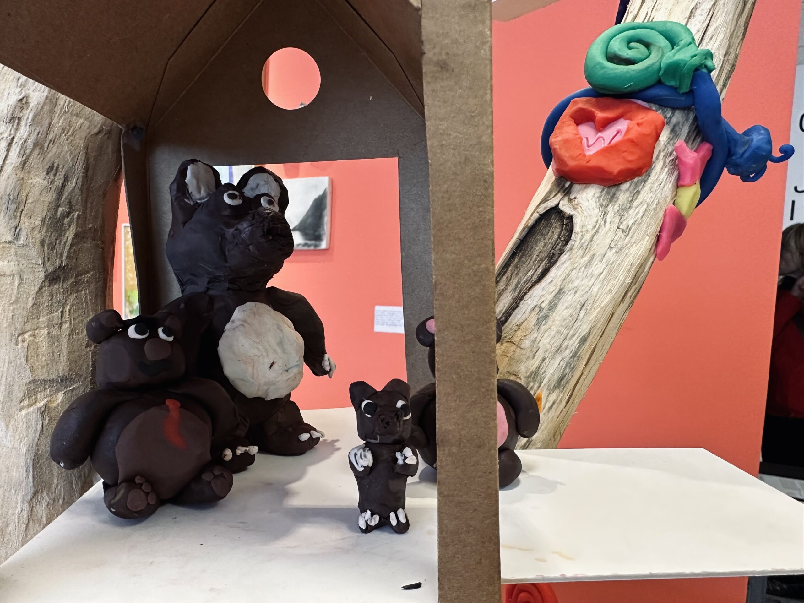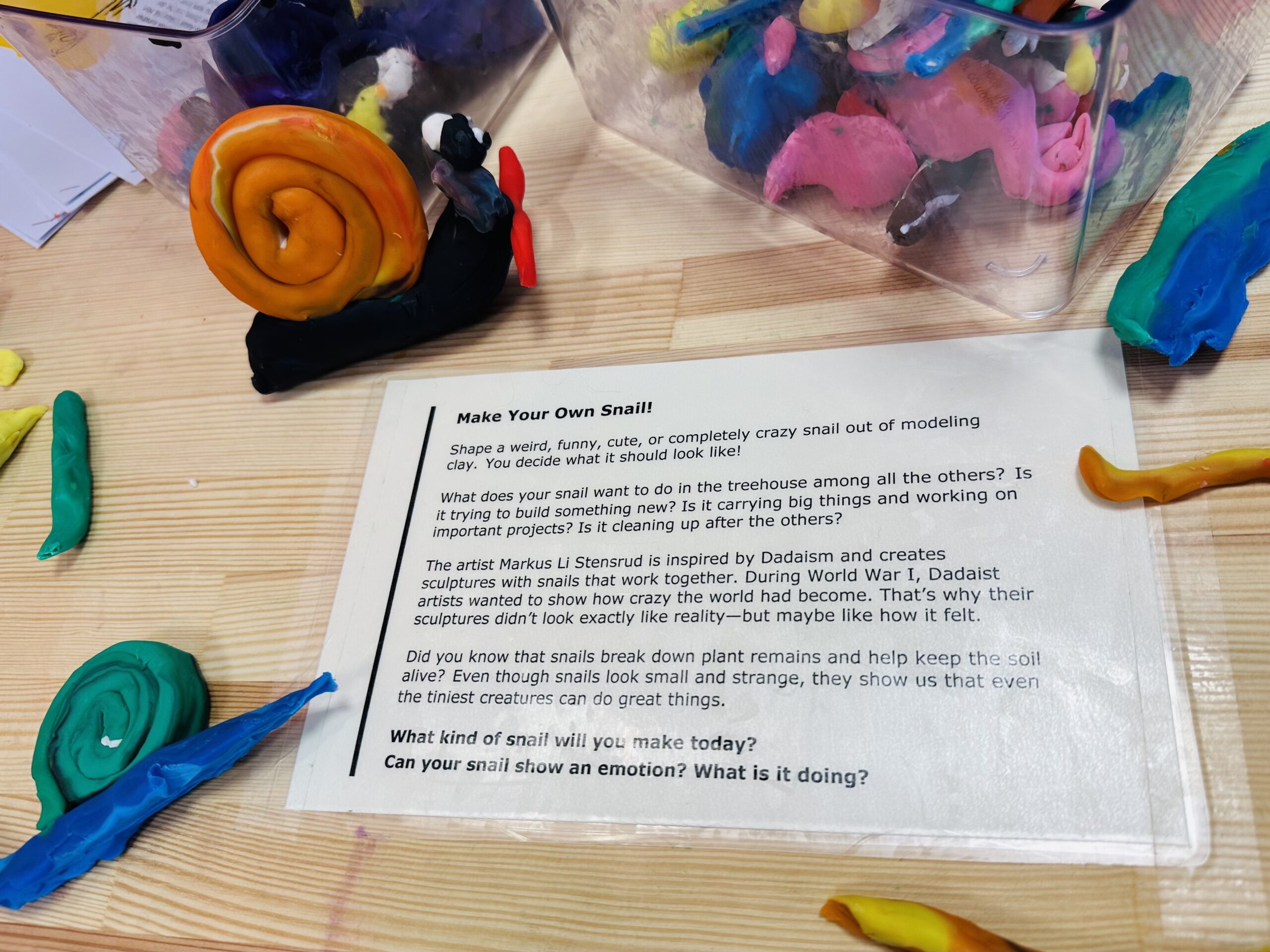 Am avut ocazia aici să admirăm lucrările lui Markus Li Stensrud, un artist din Oslo, care, influențat de curentul dadaist, creează printre altele sculpturi cu melci care lucrează împreună. Și, plecând de la asta, erai invitat să lucrezi în plastilină la o masă din incintǎ – sǎ contribui și tu la lumea melcilor, să creezi melci colorați alături de alți vizitatori din diverse colțuri ale lumii. O activitate care a pasionat-o pe fetița mea și o idee minunată.
