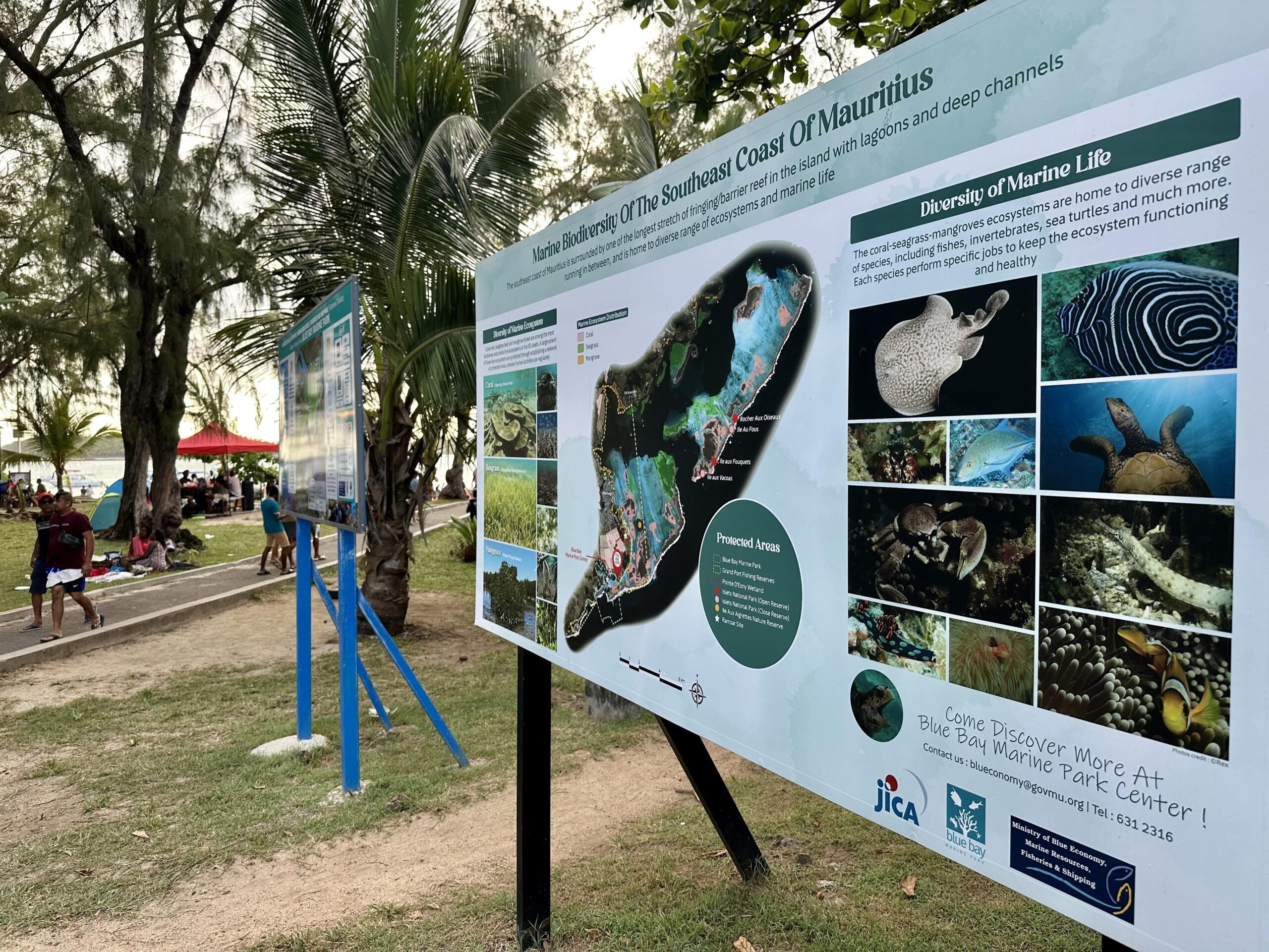 Blue Bay are o plajă frumoasă, animată, și cu un parc marin protejat, este unul dintre cele mai bune locuri pentru snorkeling, pentru admirat coralii și cules scoici la mal – nouă ne place mult vânătoarea asta de comori marine. La final, le folosim să ne decorăm castelul de nisip. Ca element inedit, plaja este chiar în apropierea aeroportului și avioanele zboară chiar deasupra ta. Unora le place, altora mai puțin. Pe noi nu ne-a deranjat și categoric trecem Blue Bay pe lista locurilor de văzut în Mauritius. Uneori plaja devine foarte aglomerată, dar te poți depărta puțin, pentru că există o zonă care nu este foarte populată unde lumea face snorkeling și de unde pleacă bărcile pentru scufundări.