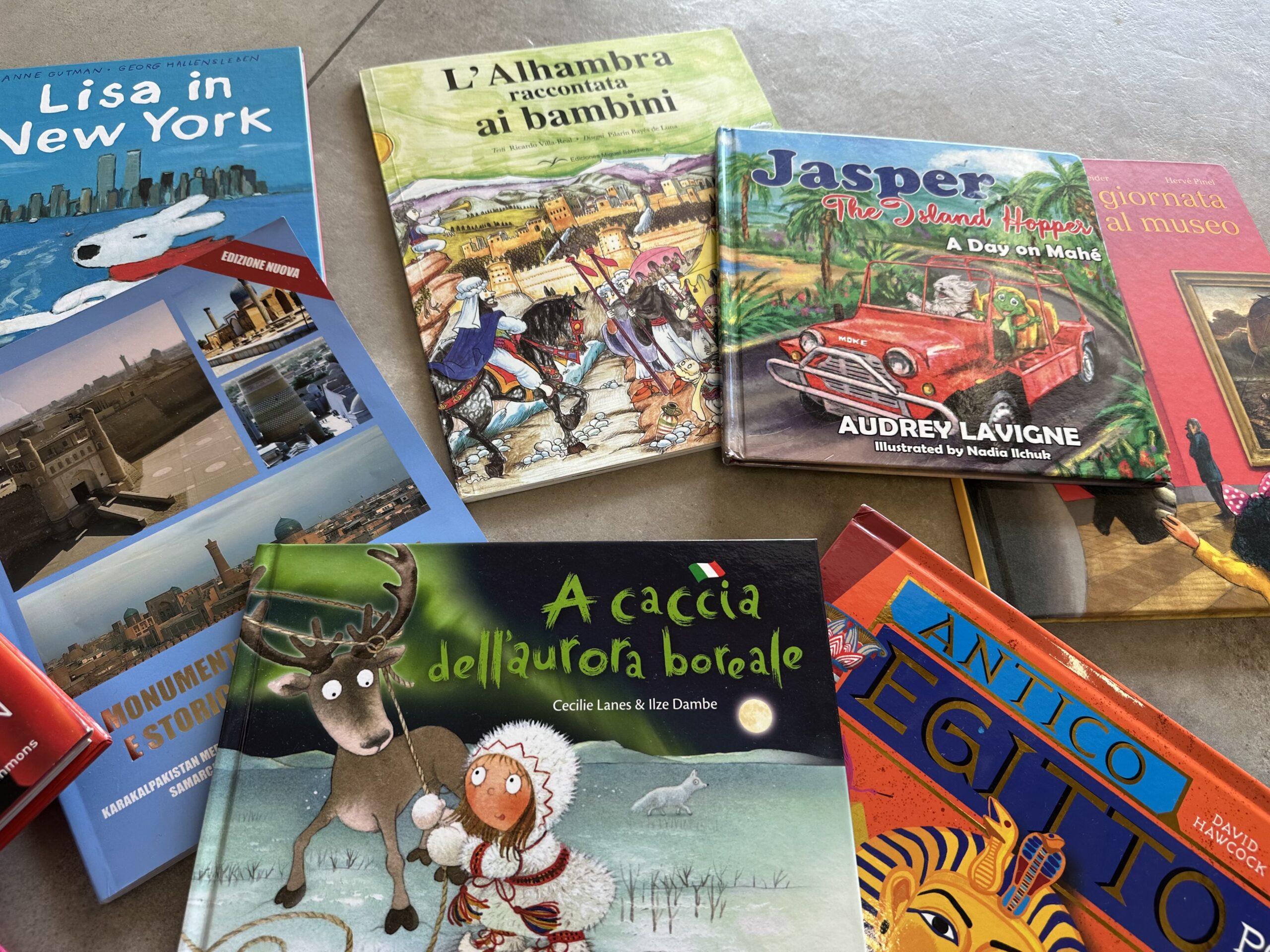 Și-apoi sunt amintirile din călătorii: „Lisa in New York”, pe care am găsit-o într-un micuț magazin din Harlem, pe când Catti încă mergea legănat, după ce am dormit cu ea în brațe la gospel 😅, „Vânând Aurora Boreală”, pe care am luat-o dintr-un magazin al comunității Sami din Tromsø, „Alhambra povestită copiilor”, pe care am cumpărat-o când am vizitat Andaluzia, după o zi de ploaie torențială în Granada, unde ne-am întors a doua oară să vedem Palatul Alhambra, pentru că în prima zi nu am mai prins bilete. A doua zi a fost cu noroc, dar a plouat cu găleata în timp ce ne plimbam prin grădinile Alhambra.
